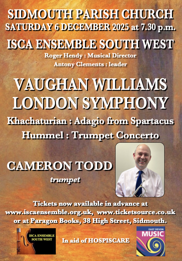 Sidmouth Parish Church was well packed with concert-goers on Saturday evening last to hear a terrific programme of music delivered by the ISCA ensemble, enlarged to cope with the increased orchestration of the pieces played. Music Director Roger Hendy programmed three excellent and popular works for this event aimed at providing additional funds to Hospiscare through a retiring collection.
